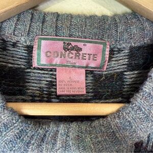 Authentic vintage men’s sweater vest by Concrete Mix featuring a bold black and gray geometric knit. Tagged a men’s size L, made in Hong Kong from 100% acrylic. Classic 80s/90s boxy fit with ribbed trim at the neck, sleeves, and hem. Still new with original tag attached—true deadstock!