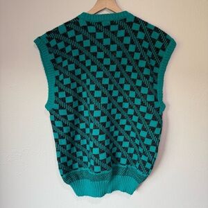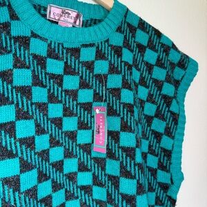 Turn heads with this bold and rare vintage sweater vest by Concrete Mix. Tagged a men’s XL, it features a striking teal and black geometric knit, ribbed trim, and classic boxy 80s/90s fit. Made in Hong Kong from 100% acrylic and still has the original tags attached. A true deadstock gem.