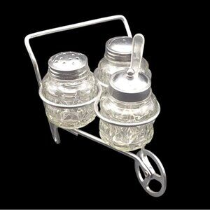 Vintage Condiment Wheelbarrow 3 Clear Cut Glass Containers Shakers & Jam Spoon
