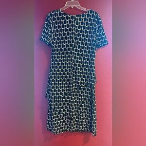 Step into timeless elegance with this vintage Connected Apparel dress in a size 16. Made from 100% polyester, this striking piece features a bold black and beige oval circle print, a flattering V-neckline, and tiered asymmetrical hem for added flow and movement. Perfect for cocktail parties, dinners, or professional gatherings.