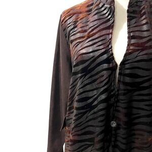 Eye-catching vintage maxi burn out maxi coat, featuring a dramatic zebra print that adds an element of bold sophistication. This unique piece showcases long sleeves, a distinctive single button , and a flattering silhouette. The duster is designed with an unconventional handkerchief hem, providing an effortless and stylish drape. Perfect for making a statement at a gallery opening, adding flair to a cocktail party, or elevating an evening at the theater, this dress brings a touch of avant-garde elegance to any occasion.