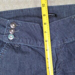 Elevate your vintage game with these Contempo low rise flared leg blue jeans. The solid pattern and 3 colored button accents give a nod to the 90s while the medium fabric wash ensures a timeless look. Perfect for juniors’ sizes, these jeans are a must-have for any woman’s wardrobe. The flared leg style adds a touch of retro flair to any outfit, making them a versatile addition to your closet. Whether you’re dressing up or dressing down, these jeans are sure to turn heads.