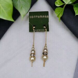 - These vintage Contempra earrings showcase an elegant blend of faux pearls and rhinestones. Their elongated design offers a sophisticated touch to any ensemble. The earrings are mounted on their original packaging card, preserving their nostalgic charm.