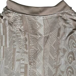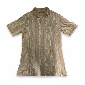 Vintage Coogi polo shirt FEATURES a unique, abstract pattern (including spellout) woven into the fabric in sophisticated neutral colors. Embroidered "Coogi" script logo in gold thread on the collard. Logo-engraved mother-of-pearl-style buttons. Short sleeves. Neutral, earthy color tones.