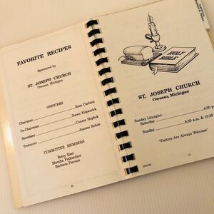 Vintage Cookbook "Seasoned Love St. Joseph Church" Owosso, MI. In pre-owned but good condition. The tabs for each section have been folded over. Other than that great cookbook! Unsure about the year of product but looks like late 90s or early 2000s.