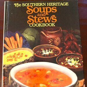 This is a vintage cookbook titled 'Soups and Stews'. It is part of The Southern Heritage Cookbook series published by Oxmoor House in 1983. This vintage series of cookbooks was distributed by Southern Living. It is in very good condition with minor wear to the edges and corners from shelving. The pages are clean and crisp.