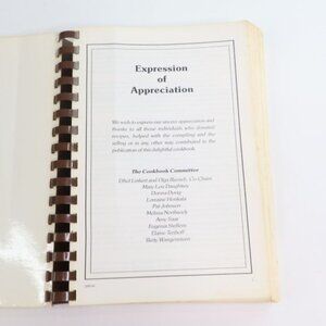 Please Note: the coupon section in the back, the pages were wet at one time so they are wavy. Other pages are secure and intact and overall in good condition. I did see a page with "good" written on it with staining. There might be other pages with staining/writing that I might have missed when going through this cookbook.