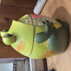 Vintage Cookie Jar Holt Howard Anthropomorphic Frog 9" Japan Rare Vintage Cookie Jar Holt Howard Anthropomorphic Frog 9" Japan Rare. This rare vintage Holt Howard Frog with Pink Bow Tie 9" Cookie Jar from Japan features a medium-sized ceramic and porcelain construction, with a unique frog shape and green color. The set includes a lid and is designed in a vintage/retro style, making it a charming addition to any kitchen storage and organization collection. With its whimsical animal theme and original design, this collectible cookie jar is sure to be a talking point for any collector of vintage kitchen decor. Items has signs of wear inline with age. Cookie jar has some stains and paint chips. See photos for condition.