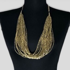 This vintage jewelry set radiates elegance with a gold-tone multi-strand beaded necklace and matching bangle bracelets. The cascading necklace offers adjustable closure, while textured bangles complete the cohesive and glamorous look.