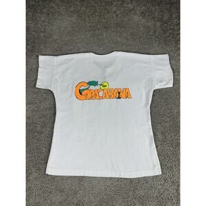 Lace-up v-neck design with metal grommets, short sleeves, and chest pocket. Classic beach souvenir style, likely 1990s based on tag and design.