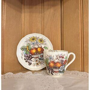 Lovely decorative demitasse cup and saucer set in the Reynolds pattern. Crafted from fine bone china, it features a vibrant harvest fruit and floral design. This set brings elegance and a touch of vintage charm to any collection or tea service.