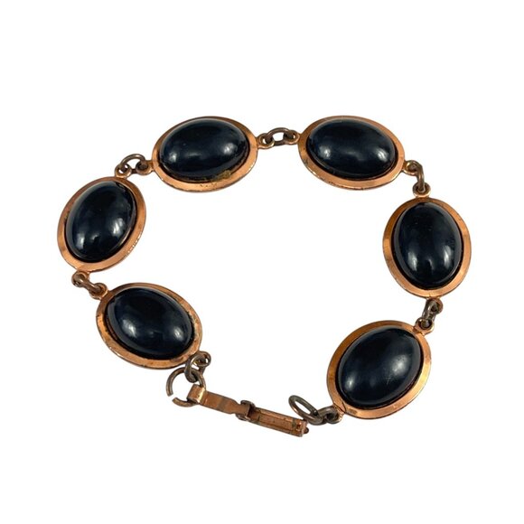This vintage bracelet features an elegant array of oval black stone cabochons set within warm copper frames. The harmonious blend of copper's radiant glow with the deep allure of black stones offers a timeless aesthetic. Its linked design ensures both comfort and style, making it a noteworthy accessory.