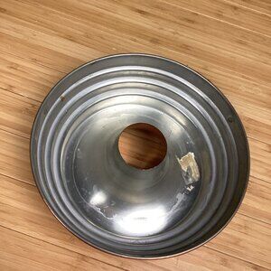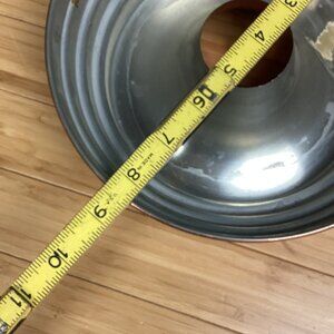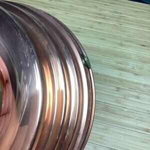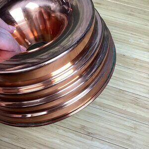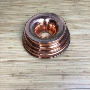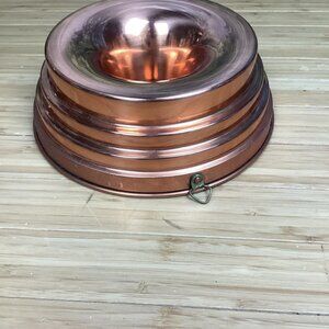 Vintage bunt pan, copper on outside and tin lined. 8" across and 3" high. Has a brass hanger for storage. A few marks and scratches but overall good used condition.