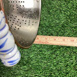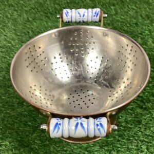 Porcelain blue and white handles. Brass with copper colander strainer with tin lining.