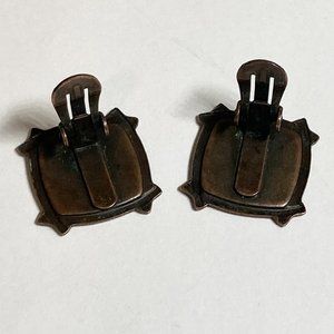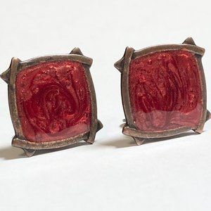 Vintage Copper Enamel Clip On Earrings Orange Red Swirl Artisan Unsigned