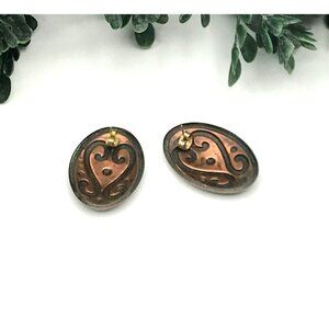 Vintage Copper Enamel Oval Earrings With Heart & Swirl Design