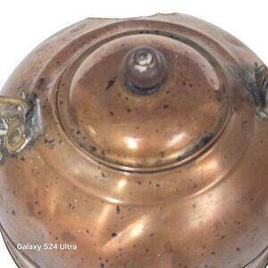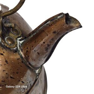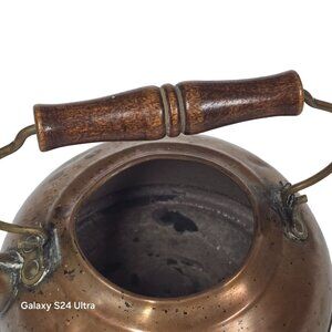 This charming vintage teapot features a rustic copper body, brass fittings, and a wooden handle, making it a delightful addition to any collection.