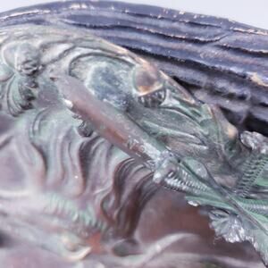 Features an Elk motif with acorn border and antler base. Open spot to hold ink jar, with a standing elk. Pen rest features a quill pen with bird talon, feathers, and broken egg.