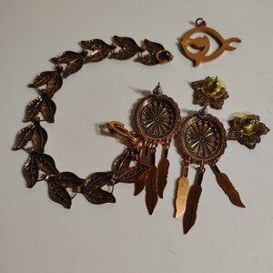 Vintage Copper Jewelry Set Southwest Native Tribal Earthen Feathers Leaf