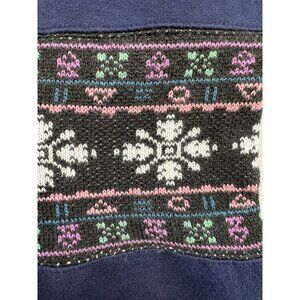 This vintage Copper Key sweater features a unique Nordic-inspired pattern across the chest and sleeves. Made in Thailand with a blend of polyester, acrylic, and cotton, it offers warmth and style for the colder months. The navy blue color complements the intricate design, making it a standout piece. This is a vintage piece so the sizing is smaller. Check pictures for exact measurements.