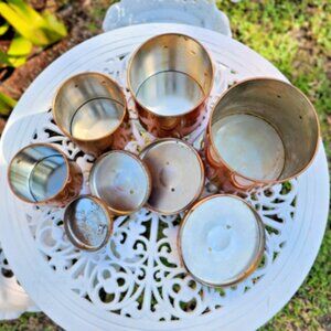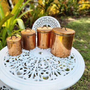Vintage Copper Kitchen Essentials Nesting Canister Set of 4. This vintage copper set with Brass plaques on the front identifying the contents. Flour, Sugar, Coffee, and tea is a unique piece. Add timeless charm to your home with this beautiful vintage copper set featuring a rich, warm patina and artisan detailing. This set is perfect on your outdoor patio, in your garden or adding a touch of warmth to your home as a decorative piece, serving platter, table centerpiece, or wall décor. Ideal for vintage collectors or anyone who appreciates copper metalwork. With its unique and rustic appearance, this tray is a rare and collectible piece of metalware that adds a touch of vintage charm to any home or collection. Approximate Measurements: Flour: 7"x9" ; Sugar: 6"x8" ; Coffee: 5”x7” ; Tea: 4.25”x6”