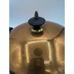 This vintage copper metal sauce pan with a 10" diameter features a round shape and a black handle, adding a touch of retro charm to any kitchen. The two-piece set includes a saucepan and its accompanying lid, making it perfect for cooking or decoration.