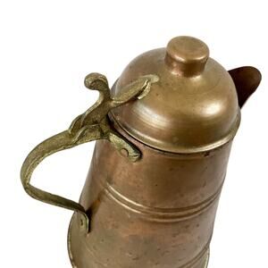 Vintage Turkish copper pitcher with applied brass handle and hinged lid. The piece does have significant patina from time. This can be chemically removed if desired.