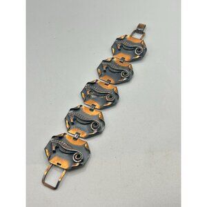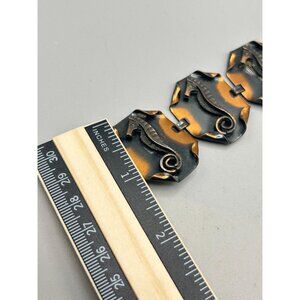 Tags: vintage bracelet, copper jewelry, seahorse bracelet, hexagonal links, fold over clasp, retro fashion, collectible jewelry, copper seahorse, statement bracelet, nautical jewelry