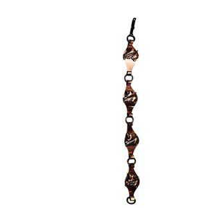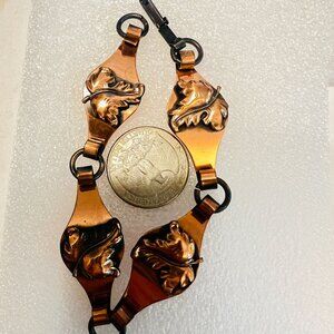 A charming vintage copper bracelet featuring leaf motifs, black accents, and a secure clasp. 7.5 inches long, suitable for versatile styling.