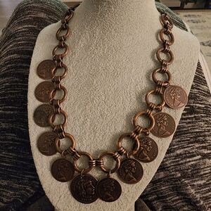 Vintage Copper Tone Foriegn Coin Charm Statement Necklace Bracelet Set Roman EUC