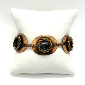 This vintage bracelet showcases a classic design with black and copper-tone gold wreath accents. It features a fold-over clasp for easy wear.