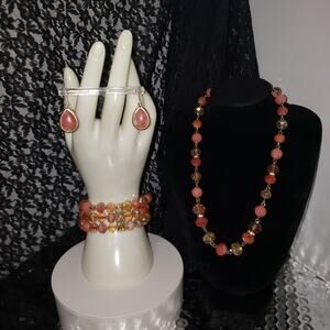 Elevate your style with a radiant vintage 3-piece coral fashion jewelry set, where faceted beads shimmer in warm coral, orange and gold tones. This matching necklace, bracelet, and earrings trio evokes timeless glamour—ideal for special occasions, heirloom gifting, or everyday luxe.