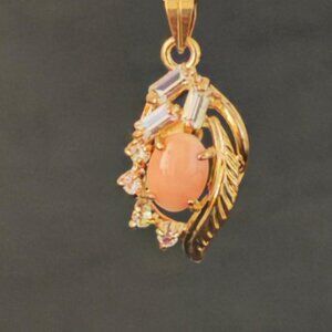 Stunningly crafted pendant features semi-precious gemstones Coral, Swarovski crystals and 18k gold electroplate by designer Dolphin Ore between 1994 and 1997. It's vintage new old stock; it's never been sold or worn before. Dolphin Ore jewelry created in the 1990s is collectible according to curation by Nasvete. It was MANUFACTURED to LAST A LIFETIME!