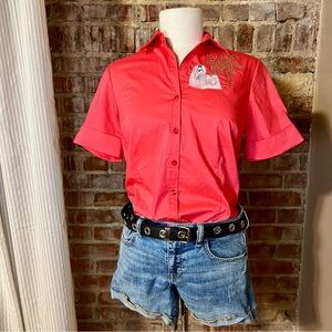 Vintage Coral Shirt with Dog and Palm Tree Embroidery -Size S -TP43