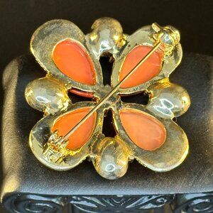 Make a statement with this vintage gold-tone floral brooch, featuring stunning coral-orange teardrop stones paired with sky-blue and turquoise cabochons. The combination of warm and cool tones creates a vibrant, summery contrast that instantly brightens any outfit.