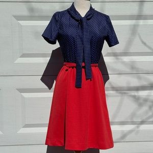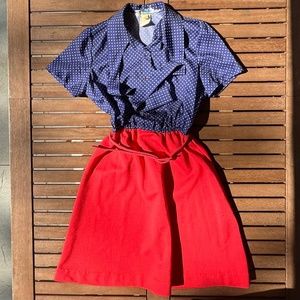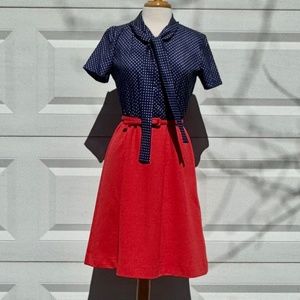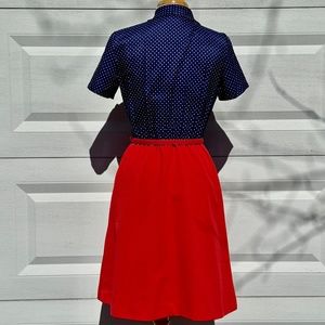 This dress with jacket and belt is the real deal. It's just so darn fun! The dark blue short sleeve top with small white diamonds all over it looks like polka dots from far away, buttons down the front until elastic waist of skirt portion. The necktie is not removable without tailoring. The belt and jacket is made from thew same fabric as the skirt of dress. The jacket has no labels and may be handmade.
