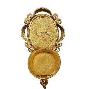 This vintage Corday gold-tone locket brooch features an ornate floral design within an oval shape cabochon. Its elegant craftsmanship offers both beauty and functionality with a hinged compartment suitable for storing small keepsakes. This piece exudes vintage charm and adds a touch of sophistication to any attire.