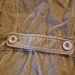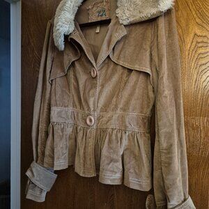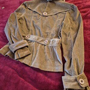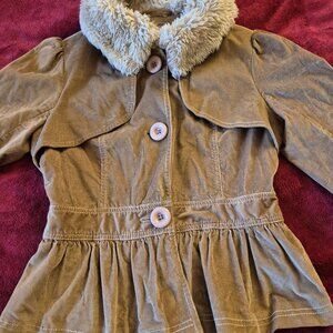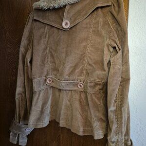 This jacket is super stylish and includes many design details, including buttoned fabric on both sleeves and in the back. The shell is $74% cotton, 24% rayon, 2% spandex. The hearty faux fur sherpa collar is $85% acrylic, 15% poly. I absolutely loved this jacket but it no longer fits :-( One extra button is included.