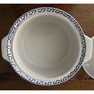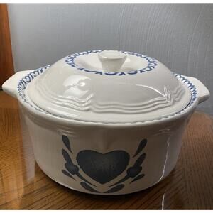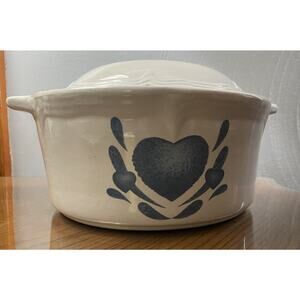 Vintage Corelle Blue Heart Stoneware 2 Handle Covered Casserole Dish 2 qt. Preowned in excellent condition. The only issue is the bottom shows wear in the last listing photo. Dishwasher and microwave safe. Heavy item.