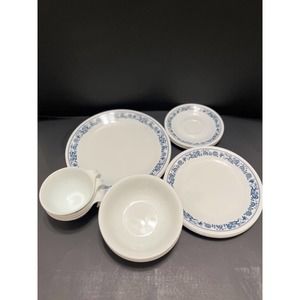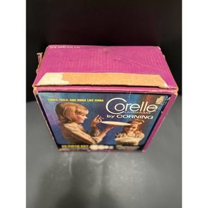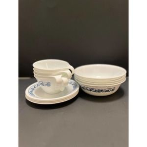 Very Rare, Collectable, Vintage, New In Box Corelle by Corning Livingware Old Town Blue complete dinner set. 20 piece set. Unused. Brand New. Box in great shape. Box was opened to make sure that all pieces were new, and not broken. They still have the cardboard/paper sheets in-between all pieces. These are unused pieces.Discontinued Pattern made between 1970-1976. To find one like this in the box is unusual. Great for Collectors of this nostalgic dinnerware. Set includes 4 large plates, 4 medium plates, 4 saucers, 4 bowls, 4 mug/cups. Invoking a New England Style, the Old Town blue collection features an intricate design rendered in a classic shade of blue on white.