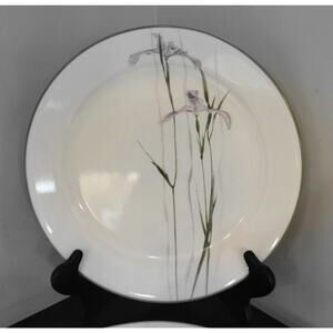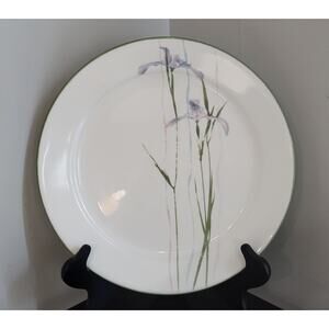 This product is a set of three vintage Corelle Shadow Iris dinner plates, featuring a beautiful purple floral pattern on a white background with a green stripe rim. Made of durable Virtrelle material, these round plates are 10 1/4" in diameter and are suitable for all occasions. They are stackable, microwave safe, and dishwasher safe, making them both practical and decorative. Produced in the United States using a fused glass technique, these original Corelle plates have a glossy finish and bear the brand's printed backstamp. Perfect for those who appreciate floral-themed dinnerware with a vintage charm.