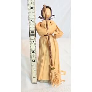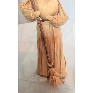This is a charming vintage corn husk doll, standing approximately 8 inches tall. She is dressed in traditional attire and carries a broom, adding to her rustic appeal. The doll features a blue head covering, giving her a distinctive look. This handcrafted doll is a unique collectible, perfect for adding a touch of folk art to your home decor. She is in great condition!