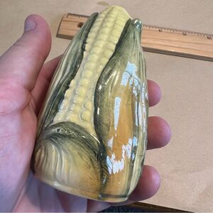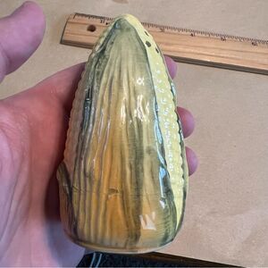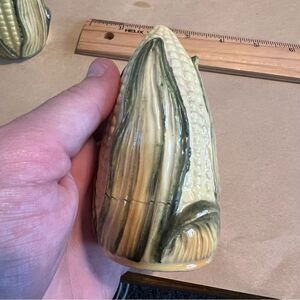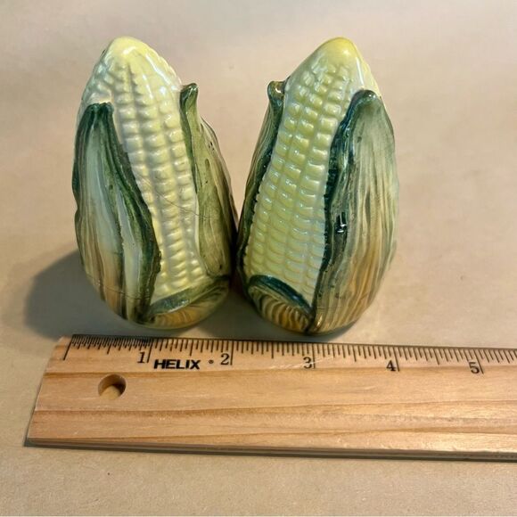 Charming corn shaped salt and pepper shakers. Features green and yellow hues. Perfect for adding a touch of whimsy to your table setting. Made in Japan. Some minor cracking and one tiny chip.