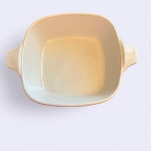 This petite casserole dish is in excellent condition with little to no fading. It has no chips or cracks. The stamp on the bottom is faded and hard to read, but still visible.