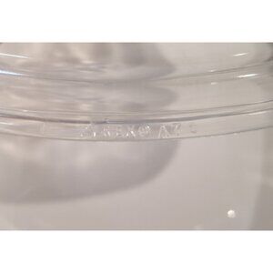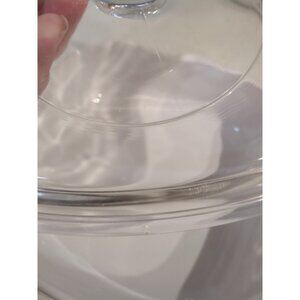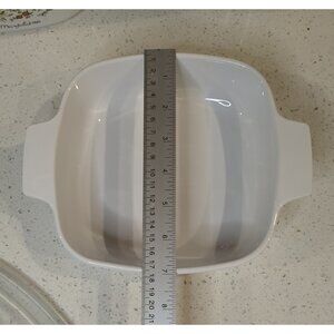 Pre-owned, good condition with minor surface scuffs on the base. Top to bottom = 4.5 inches, width = 9.5 inches (handle to handle), 6.5 inches shortest side. (measured with all 3 pieces together)