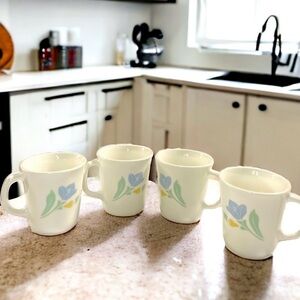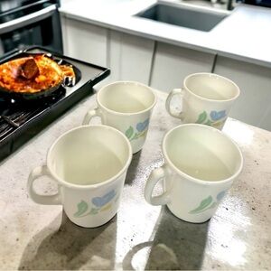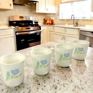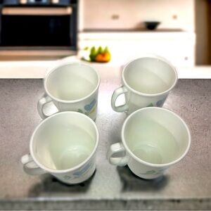 This set of 4 Corning coffee mugs are the perfect companions to your kitchen, especially if soft blues and yellows are your accent colors! They are shiny white glass, made by Corning in the 1980's with an exterior tulip pattern printed on both sides of each mug. The blooms appear to be in movement, the large blue one being open in almost a periwinkle or sky blue color, while the smaller bloom beneath is still budding done in a pastel yellow. The green stems and leaves are a celadon green color. The bases of each mug are embossed "Corning USA M'Wave OK"