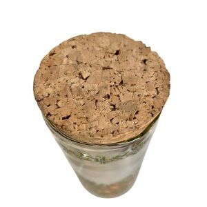 It comes with a cork lid for secure storage and measures 7.5 inches tall without the lid and 8 inches tall with the lid in place. The circumference is approximately 3.5 inches, making it a versatile size for storing dry goods or displaying as a decorative piece.