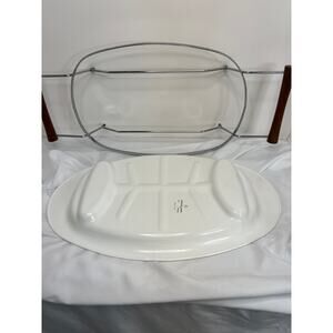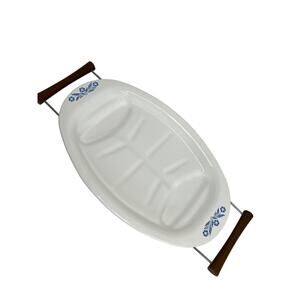 This Vintage Corning Ware Blue Cornflower Platter with Serving Stand/Tray P-19 is a set of 2 items, featuring a floral pattern with a blue and white color scheme. The oval-shaped platter is made of glass and ceramic, produced in the United States during the 1960s using pottery techniques. With a glossy finish and printed backstamp, this original piece from the Blue Cornflower product line adds a touch of American charm to any dining table or kitchen decor.