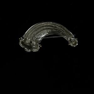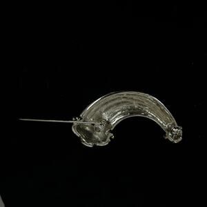 This cornucopia silver tone brooch with black and gold highlights measures 2.6 inches by 1.5 inches.