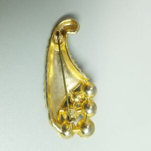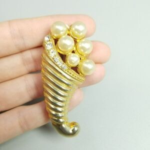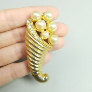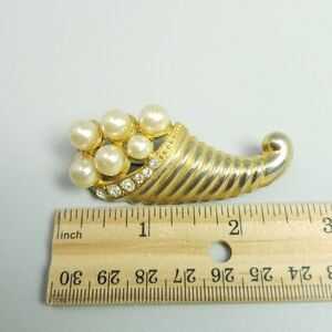 Vintage Cornucopia Gold Tone Faux Pearl and Rhinestone Brooch, Lapel Pin